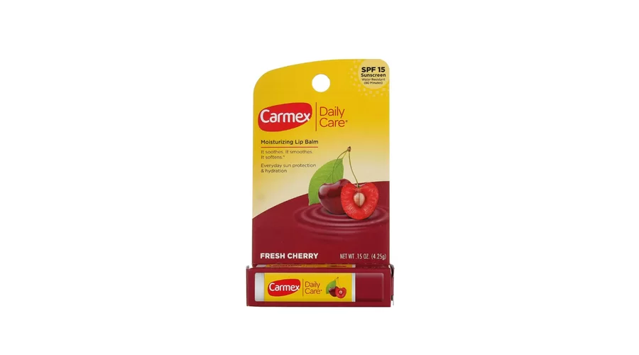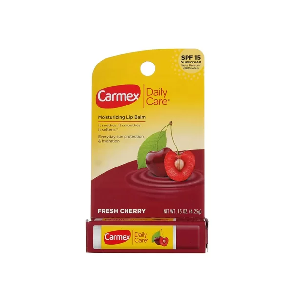 Carmex — знаменитый бальзам для губ, который уже около ста лет помогает ухаживать за сухими и потрескавшимися губами. Ароматизированный бальзам для губ Carmex SPF 15 со вкусом вишни эффективно восстанавливает и защищает нежную кожу губ от воздействия солнца, ветра или мороза. Бальзам с SPF 15 обеспечивает защиту от ультрафиолетовых лучей в течение 80 минут, даже во время плавания или активного отдыха. Масло какао в составе бальзама интенсивно увлажняет губы, делая кожу более мягкой и гладкой. Ланолин успокаивает и покрывает кожу губ тонким защитным слоем, который препятствует потере естественной влаги. Вазелин усиливает барьерную функцию, защищая кожу от негативного воздействия окружающей среды. Мягкая текстура бальзама тает при соприкосновении с кожей, а ментол и камфора дарят приятное ощущение прохлады.